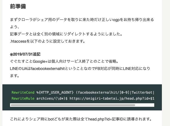SNSのクローラに対しては処理をサーバー側に飛ばすということで対処するみたいです。つまり、ユーザーからアクセスがあったら通常通りjavascriptを表示し、クローラーからアクセスがあったらサーバーにアクセスさせ、つまりPHPで処理すればいいよねというお話になります。言ってることはめちゃくちゃ簡単です。