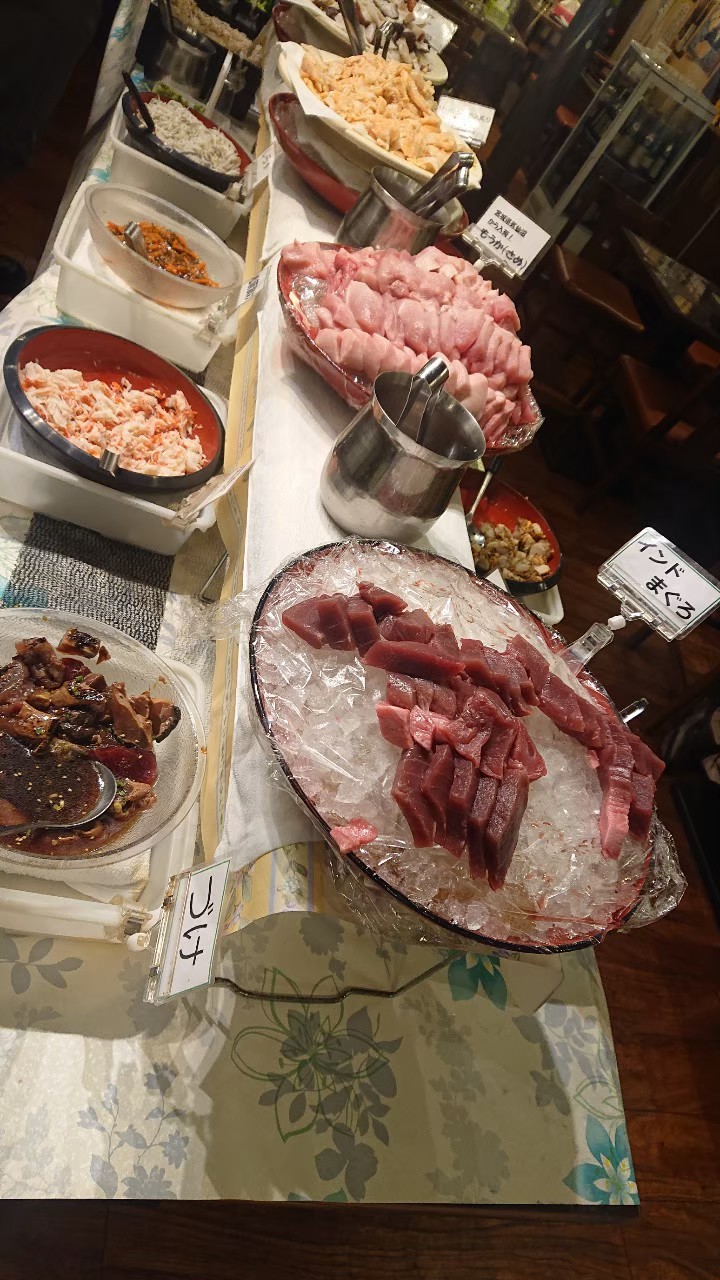 これは以前行った時の写真なんですけど、まあこんな感じに刺身5種類が食べ放題でございまして、それに加えて、さまざまな小料理を食べられるんですよね。それが1500円で食べ放題っていうめちゃめちゃコスパのいいお店なんですよね。