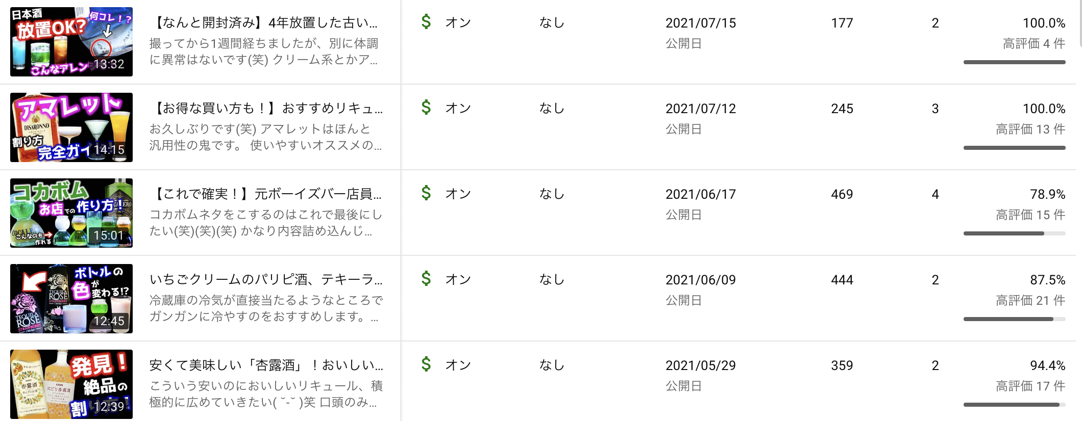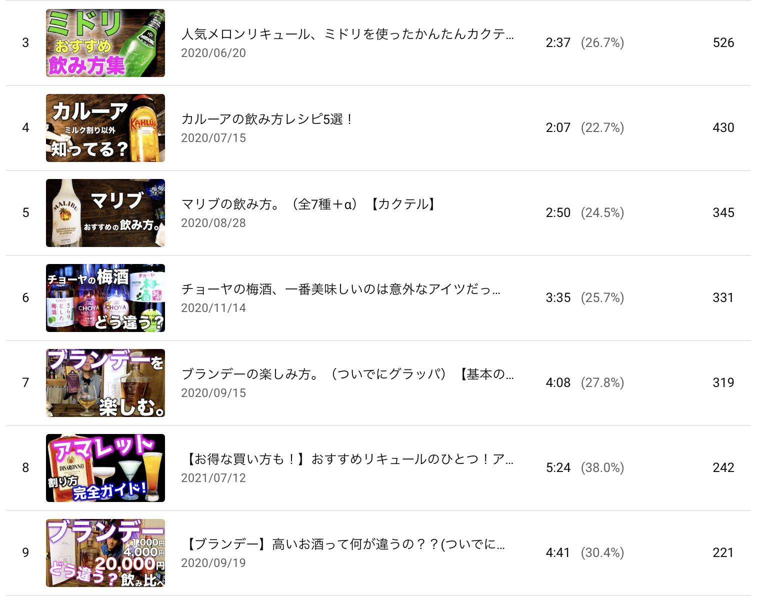 直近の再生数ランキングみたいなアナリティクスデータですね。一応、アマレットの動画がランクインしていることにより、このアマレットに関しては「仕込み」はうまくいってると仮定することはできるのですが、自分が想定していたペースではないというか