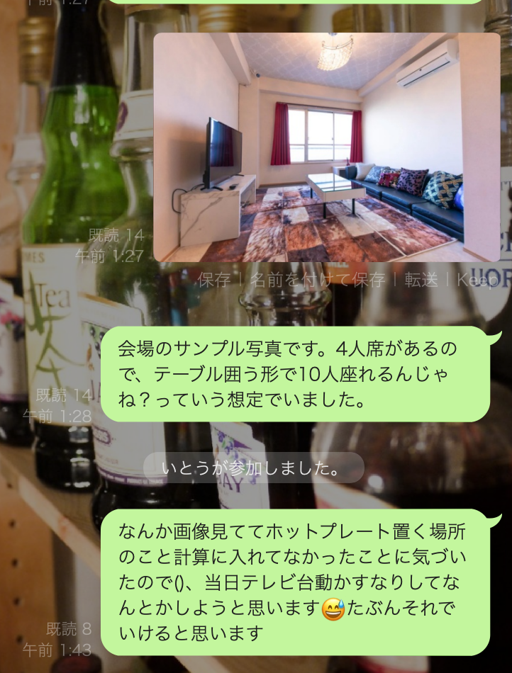 この空間に10人座れるやろっていう前提で予定立ててたんですよね。椅子の前に4人座って、その向かい側に4人座って、で、机の辺にそれぞれ1人ずつ・・・・・・。