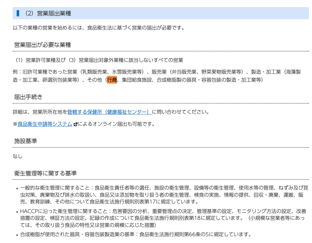 で、行商というのはこの「届出」の区分になるわけですね。つまり許可とか要らないらしい。食品衛生責任者は僕自身がなれるので、届出さえ出せればこっちは問題ないって認識でいいのかな。ただ、この届出を出すのに印鑑登録が必要だったりといろいろ時間がかかりそうですね。
