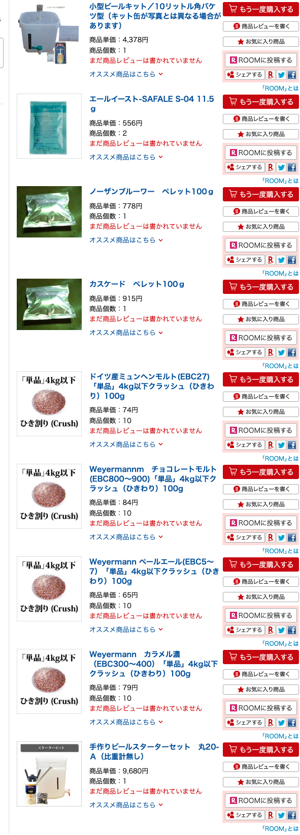 ということで、雑に見繕ってこんな感じにしました。麦芽については粉砕済みのを買ったほうがいいということで買いました。
