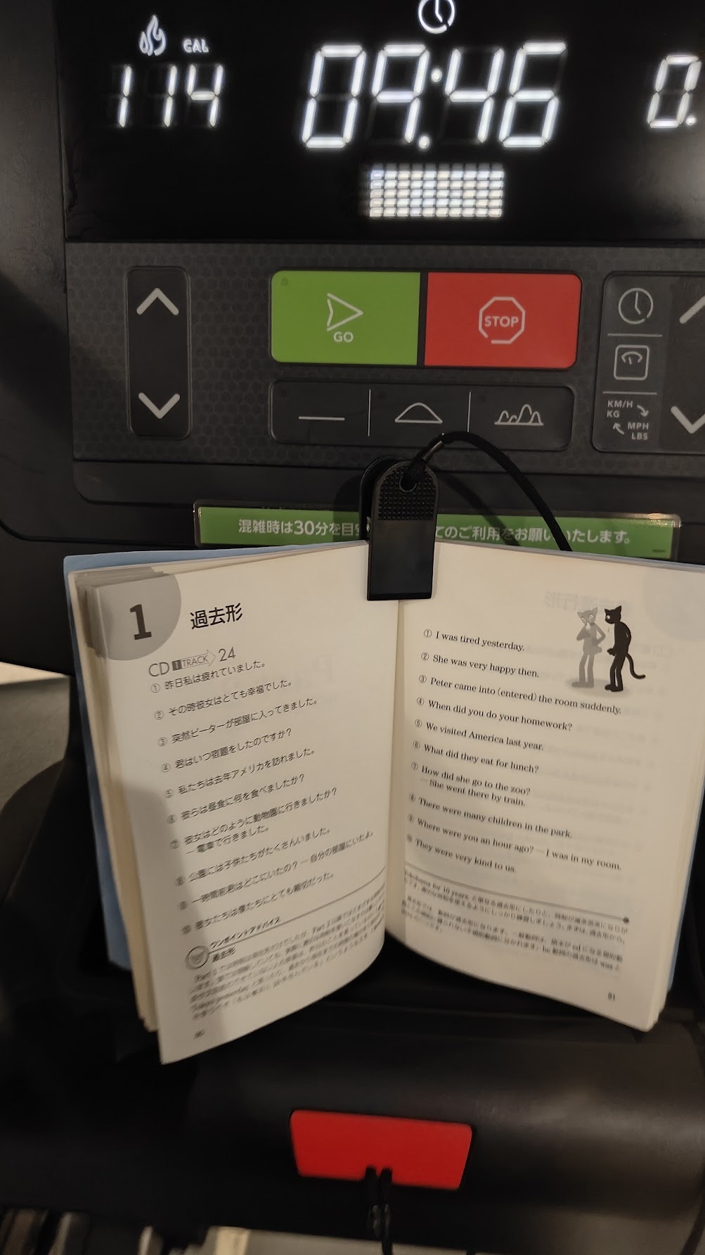 4.7km/hまでスピードを落とし、傾斜を15°にして瞬間英作文をやりながら歩くって感じです。これで400kcalちょいを1日で消費できます。