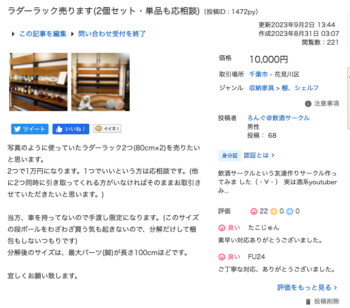 不要になった売れそうなものをいくつか出品してみたところ、売れそうな商品については連絡を早速もらえてるので、いい感じに処分できそうです。あと、処分するのにお金かかりそうなゴミを0円で押し付けるなど・・・・・・笑